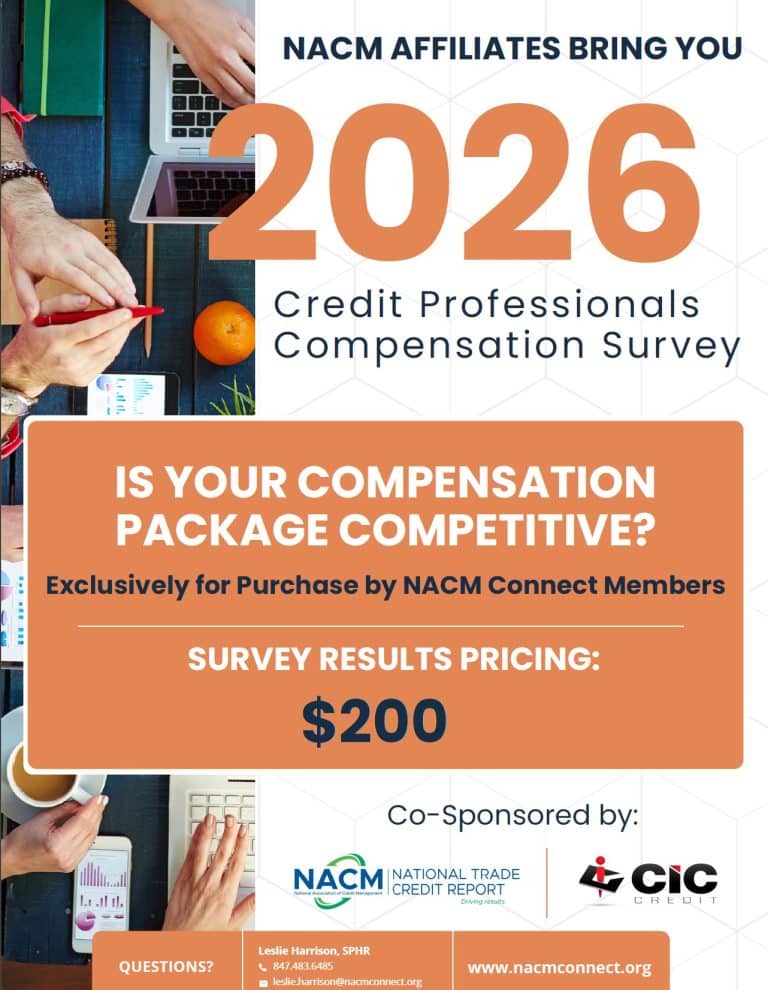 NACM Connect along with all the other NACM affiliates announce the launch of a nationwide Credit Professionals Compensation Survey. Compensation details for each credit department position will be benchmarked. Additional questions will include time-off plans, savings plans, benefit plans, and professional designations.