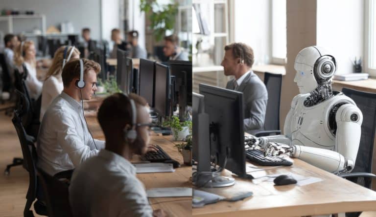 Robot and people working in modern office with computers, concept of future workplace